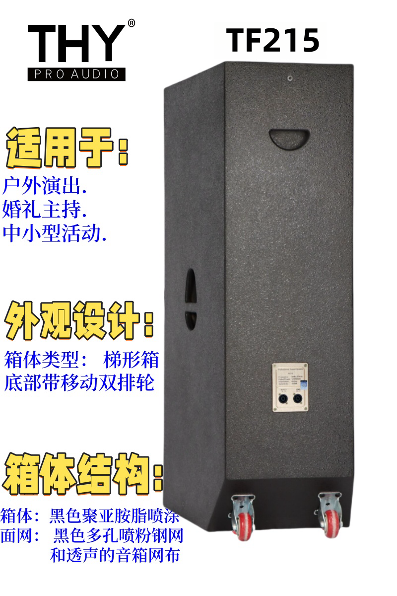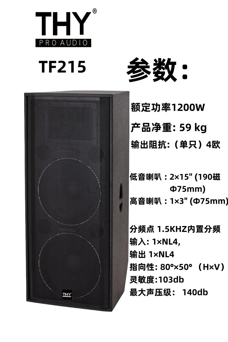 TF215 内置3分频双15英寸全频扬声器系统H215音箱是H系列音箱中的一款采用全新外形结构和表面喷漆工艺组成的3单元3分频全频音箱。是由两只15英寸低频单元和一个2英寸高频压缩驱动单元组成,低音单元采用的是180磁Φ75mm直径大功率音圈,其音圈采用的圆铜线,并采用外绕2层的方式,音圈骨架采用强度很高的TIL材料,不仅加强了音圈的强度更增加了音圈的功率承受能力。对称磁路的设计使低频单元的谐波失真减少到较低程度,充分满足了人耳对音质的要求。