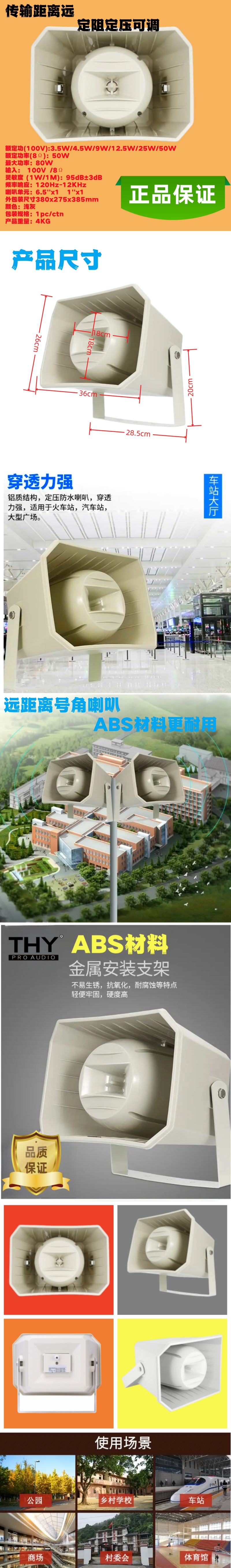 采用ABS塑胶材质机构,外壳表面呈灰白色,光滑而美观,经久耐用,采用进口防水单元喇叭,360°室外暴雨中不间断工作,全铜变压器,是保证远距离音质清晰,优美浑厚有力;适用于操场、火车站、军队、工厂、隧道等场所。