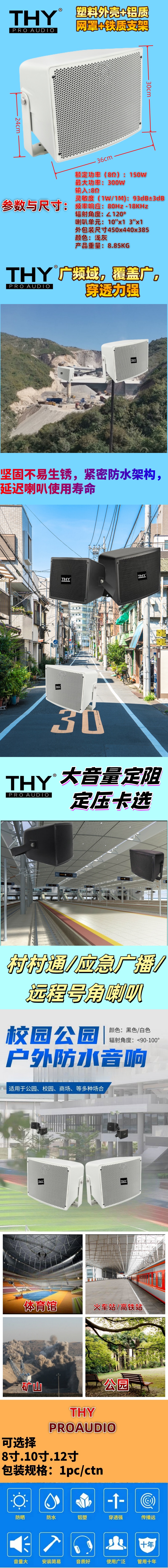 采用ABS全新材质,外壳表面呈灰白色,光滑而美观,经久耐用,采用进口防水单元喇叭,360°室外暴雨中不间断工作,全铜变压器,是保证远距离音质清晰,优美浑厚有力;适用于操场、火车站、军队、工厂、隧道等场所。